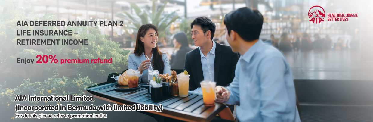 - This insurance plan is underwritten by AIA and it is not a bank savings plan with free life insurance coverage. The premium paid is not a placement of a savings deposit with the bank and hence is not protected by the Deposit Protection Scheme in Hong Kong. AIA Deferred Annuity Plan 2 is an insurance plan with a savings element. Part of the premium pays for the insurance and related costs. If you are not happy with your policy, you have a right to cancel it within the cooling-off period and obtain a refund of any premiums and levy paid. A written notice signed by you should be received by the Customer Service Centre of AIA International Limited at 12/F, AIA Tower, 183 Electric Road, North Point, Hong Kong within the cooling-off period (that is, 21 calendar days immediately following either the day of delivery of the policy or cooling-off notice (informing you / your nominated representative about the availability of the policy and expiry date of the cooling-off period, whichever is earlier).After the expiration of the cooling-off period, if you cancel the policy before the end of the term, the projected total cash value may be substantially less than the total premium you have paid.