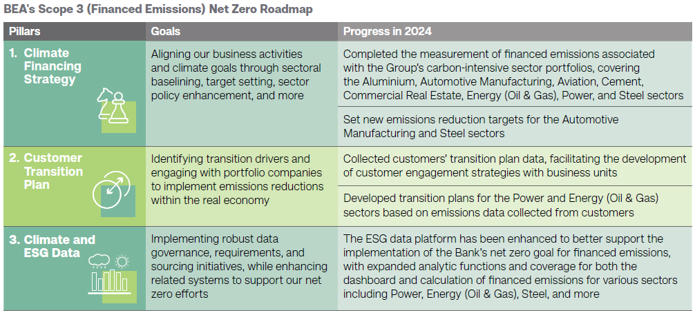 Financed emissions comprise more than 99% of the Group’s total emissions, with more than 90% originating from the Group’s corporate lending and bond investment portfolios. Recognising the important role BEA plays as a provider of capital in the fight against climate change to fulfil the aims of the Paris Agreement, we are advancing the goal of achieving net zero financed emissions by 2050 guided by the three pillars of our Scope 3 Net Zero Roadmap, and made significant progress in 2024.