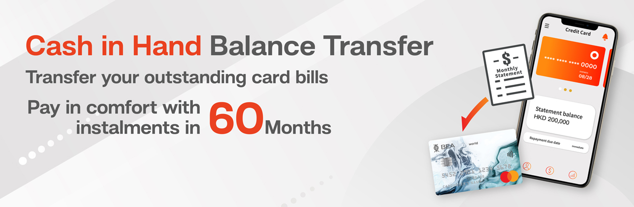 - The personalised preferential monthly flat rate of as low as 0.25% only applies to selected cardholders who draw down the Balance Transfer amount of HK$200,000 or more and a repayment period of 24 months. The annualised percentage rate ("APR") 6.07% is calculated as for a Balance Transfer amount of HK$200,000, with a monthly flat rate of 0.25%, a one-off HK$500 handling fee and a repayment period of 24 months. The APR is calculated according to the standard method set out in the Code of Banking Practice, and is rounded up or down to the nearest 2 decimal places. Please note that the actual APR may differ.