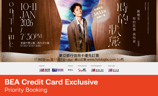 Priority booking channels: www.hotdogtix.com or HotdogTIX App [Click here for HotdogTIX purchasing flow] A limit of 8 tickets per online order applies. HotdogTIX Limited (“HotdogTIX”) reserves the right to assign separate seats (including to assign seats in odd-numbered combinations). HotdogTIX will charge a HK$35 customer service fee per ticket and HK$40 courier fee per transaction. |