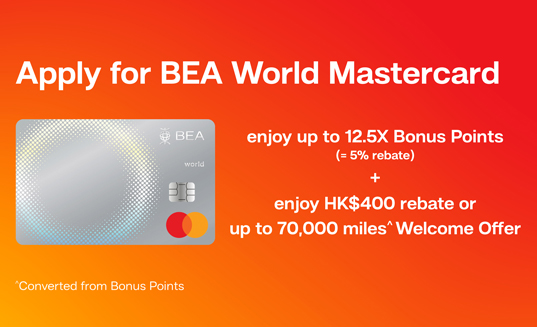 From 21 January 2026 to 31 March 2026, New BEA cardholders# can earn Welcome Offer1 of HK$400 cash rebate or up to 70,000 Miles (converted from Bonus Points2,4) by applying for BEA World Mastercard Card. For details, please refer to below table: