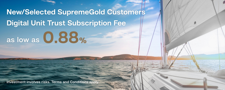 During the promotion period, eligible customers who subscribe for Unit Trusts through branches can enjoy the first-time fund subscription fee as low as 0.88%.