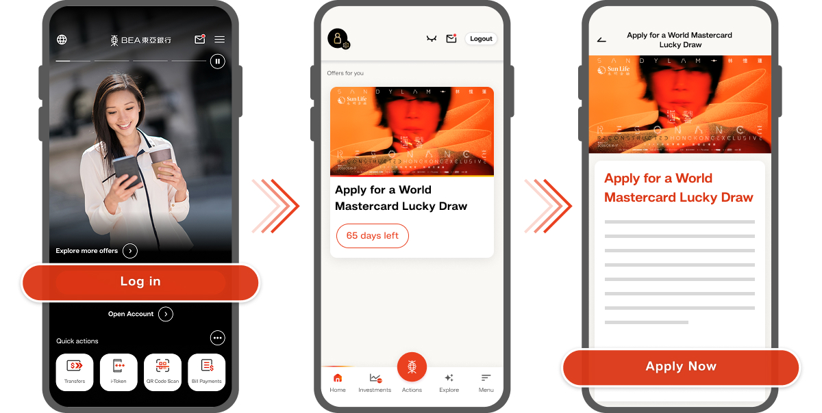 From now until 20 April 2026, new credit card customer1,2 successfully submit a BEA SupremeGold World Mastercard OR BEA World Mastercard principal credit card application can automatically enter a lucky draw for a chance to win 2 tickets to the Sun Life Presents: SANDY LAM RESONANCE : Reconstructed Hong Kong Exclusive upon successful card approval (ticket price: HK$1,688, limited to 20 winners)!