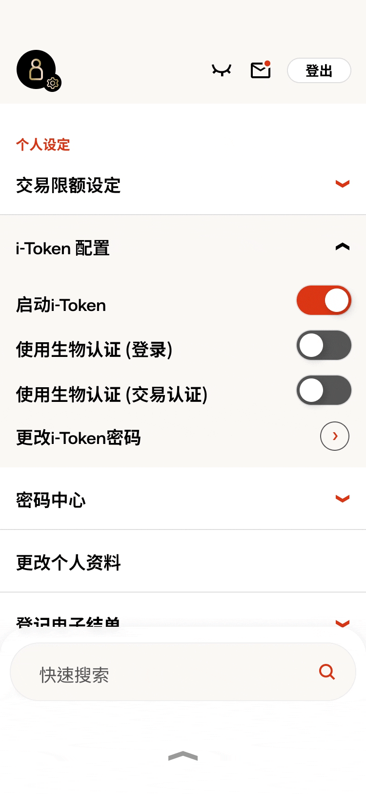 • 登录东亚手机银行 • 当启动 i-Token 后,可在「个人设定」选择「使用生物认证(登录)」或「使用生物认证(交易认证)」 • 输入你的i-Token 密码 -