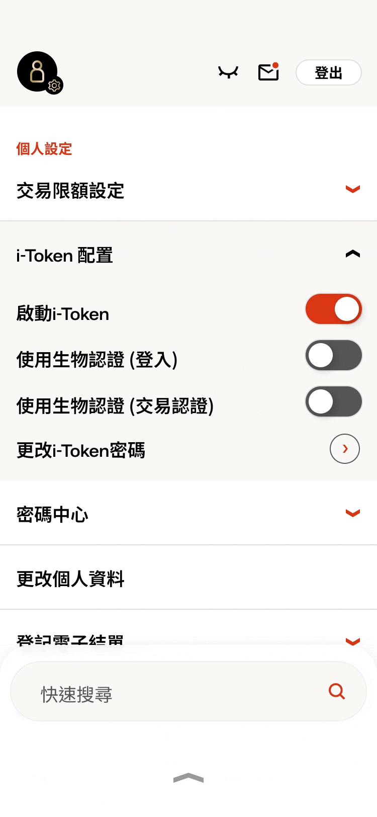 • 登入東亞手機銀行 • 當啟動 i-Token 後,可在「個人設定」並按「使用生物認證(登入)」或「使用生物認證(交易認證)」 • 輸入你的i-Token 密碼 -