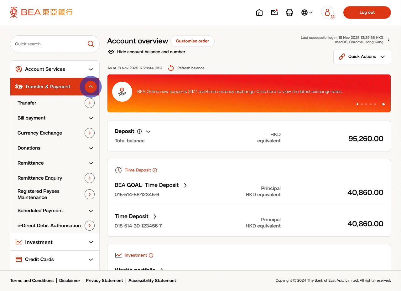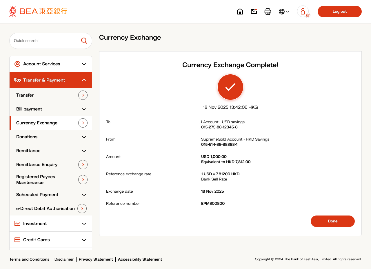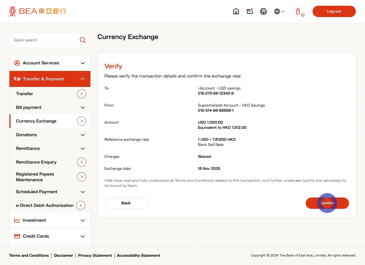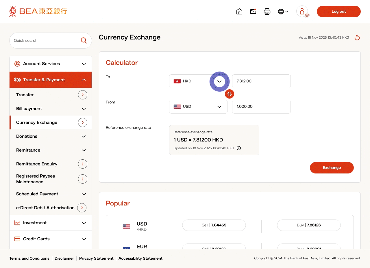 • Login to BEA Online, open the menu and select “Transfer & Payment” • Click “Currency exchange” -