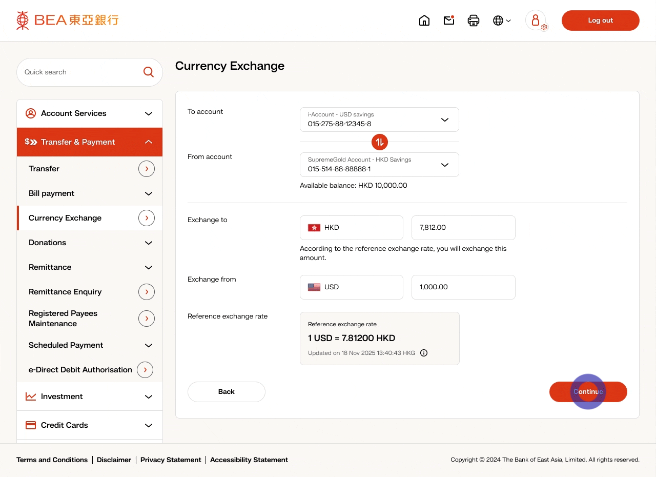 • After confirming the withdrawal account, deposit account, and reference exchange rate, click “Continue” to proceed -