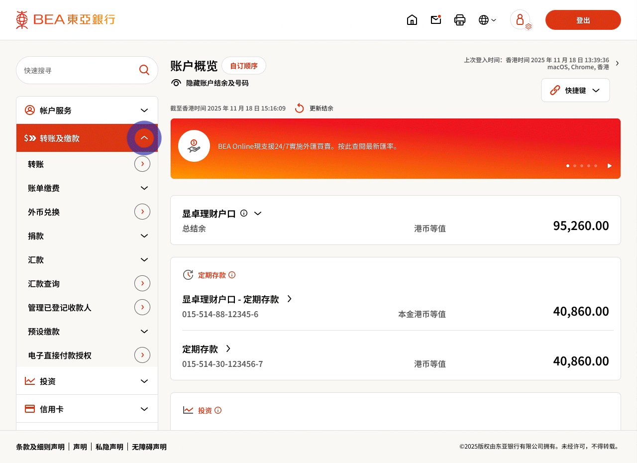 登入东亚银行网上银行,打开选单并选择「
