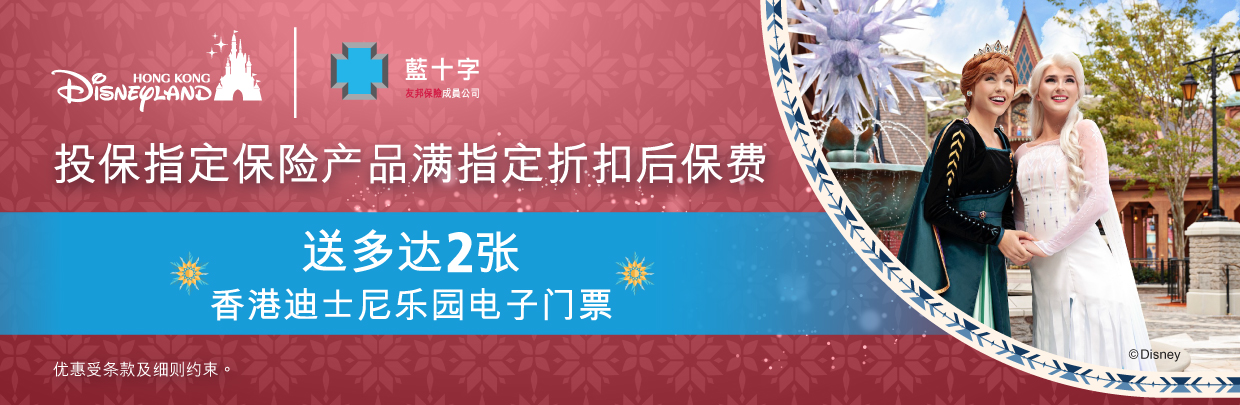 由即日起至2025年12月31日期间(「推广期」),透过东亚银行*成功投保以下指定保险产品合共满折扣后保费HK$3,000,即送香港迪士尼乐园一日游电子门票乙张,每位保单持有人最多可获赠2张,保障你和你的挚爱同时,亦可齐齐入乐园畅玩!立刻投保啦!