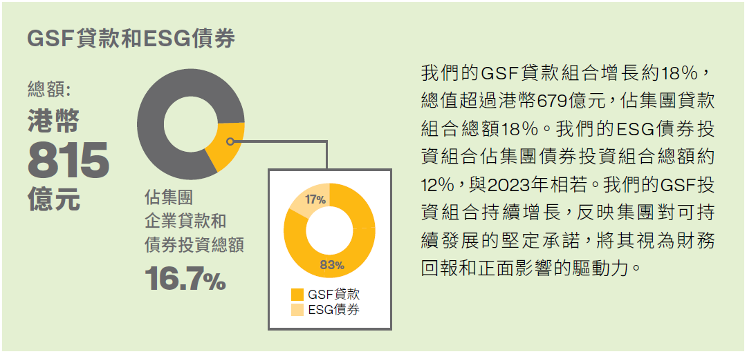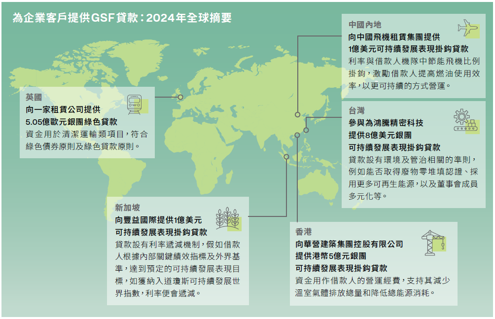 集团开发和推出了一系列以可持续发展为重点的产品及服务,以支持客户迈向自身的可持续发展目标。例如,我们为企业客户提供GSF贷款,并参与多项可持续发展表现挂钩贷款的国际项目及银团交易。