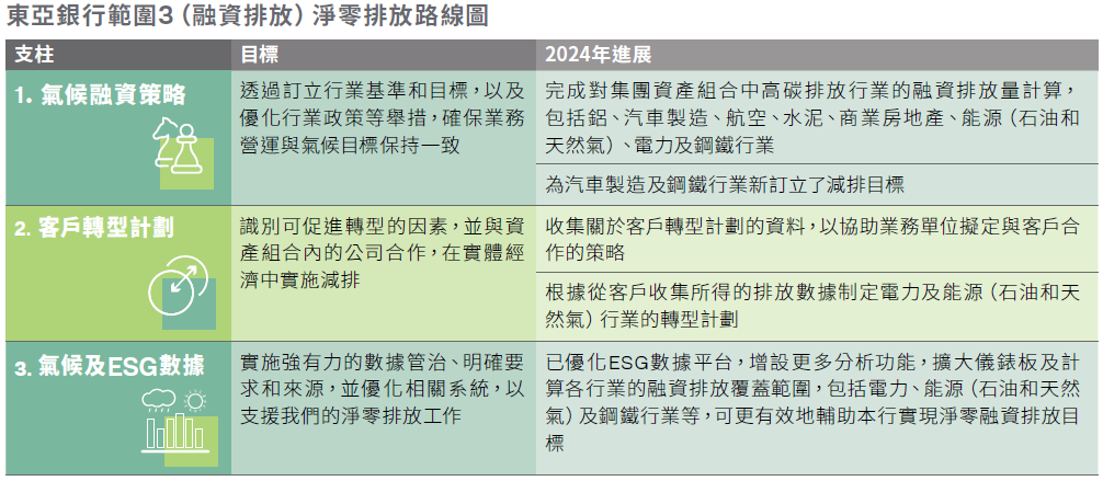 融资排放占集团总排放量逾99%,其中超过90%来自集团的企业贷款和债券投资组合。作为资本提供者,东亚银行深明其在对抗气候变化和实现《巴黎协定》的重要角色。我们现正遵循范围3净零排放路线图的三大支柱,向2050年实现净零融资排放的目标推进,并于2024年取得重大进展。