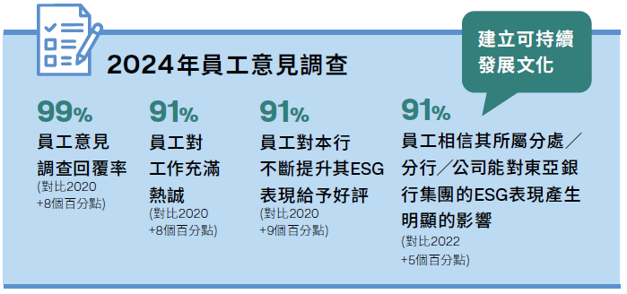 我们透过定期的集团及分处会议、与高级管理层对谈以及表现评核等渠道收集员工意见,并透过全集团的年度员工意见调查倾听员工心声,积极提升工作环境、银行文化以及员工的参与及满意度。