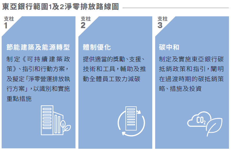 尽管融资排放占集团排放的绝大多数,我们同样深明减少自身运营排放的重要性。东亚银行承诺按科学为基础的路径,实现2030年净零运营排放的目标,并制定了「范围1及2净零排放路线图」,列出我们为实现目标所需要采取的步骤。