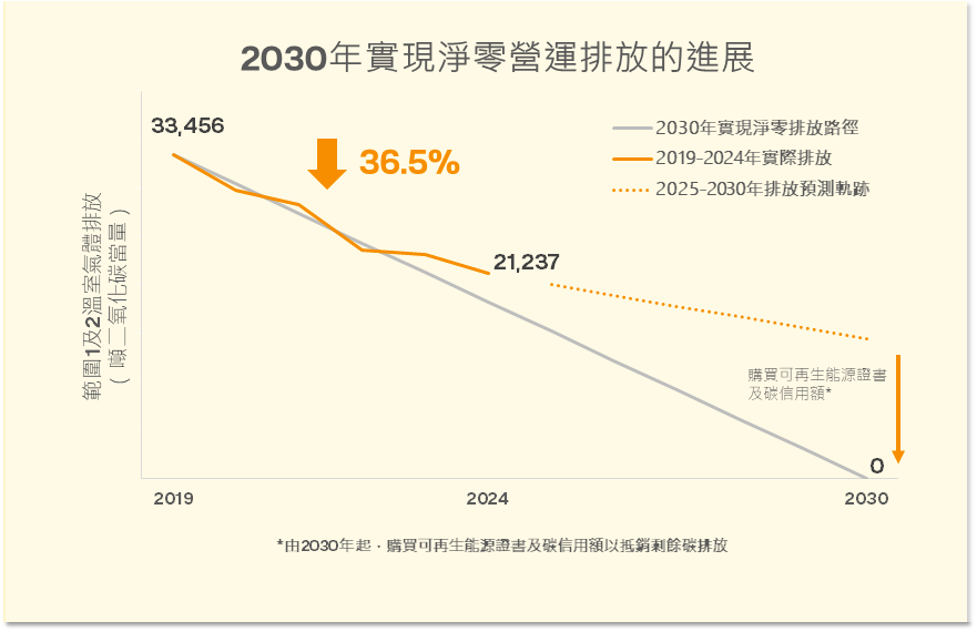 2025年,本行将向董事会ESG委员会申请核准净零营运执行方案,其中包括直至2030年的各项措施,以确保我们在此领域稳步推进。我们的目标是于2025年底,将集团营运排放量在2019年的基准上减少39%。