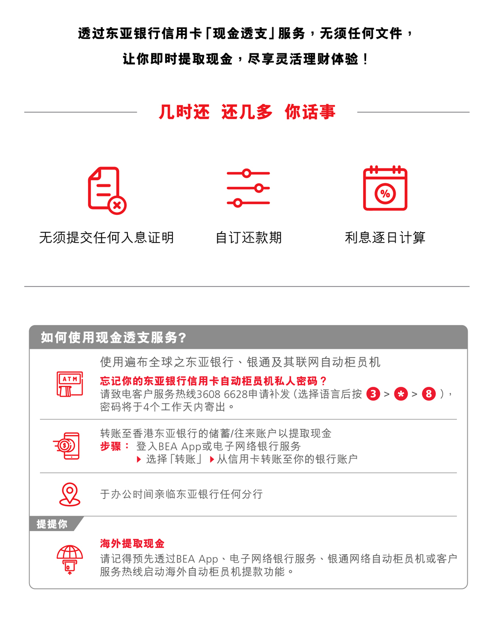 持卡人须确保有关的东亚银行信用卡账户有足够之可用信用额以进行现金透支及支付有关手续费。