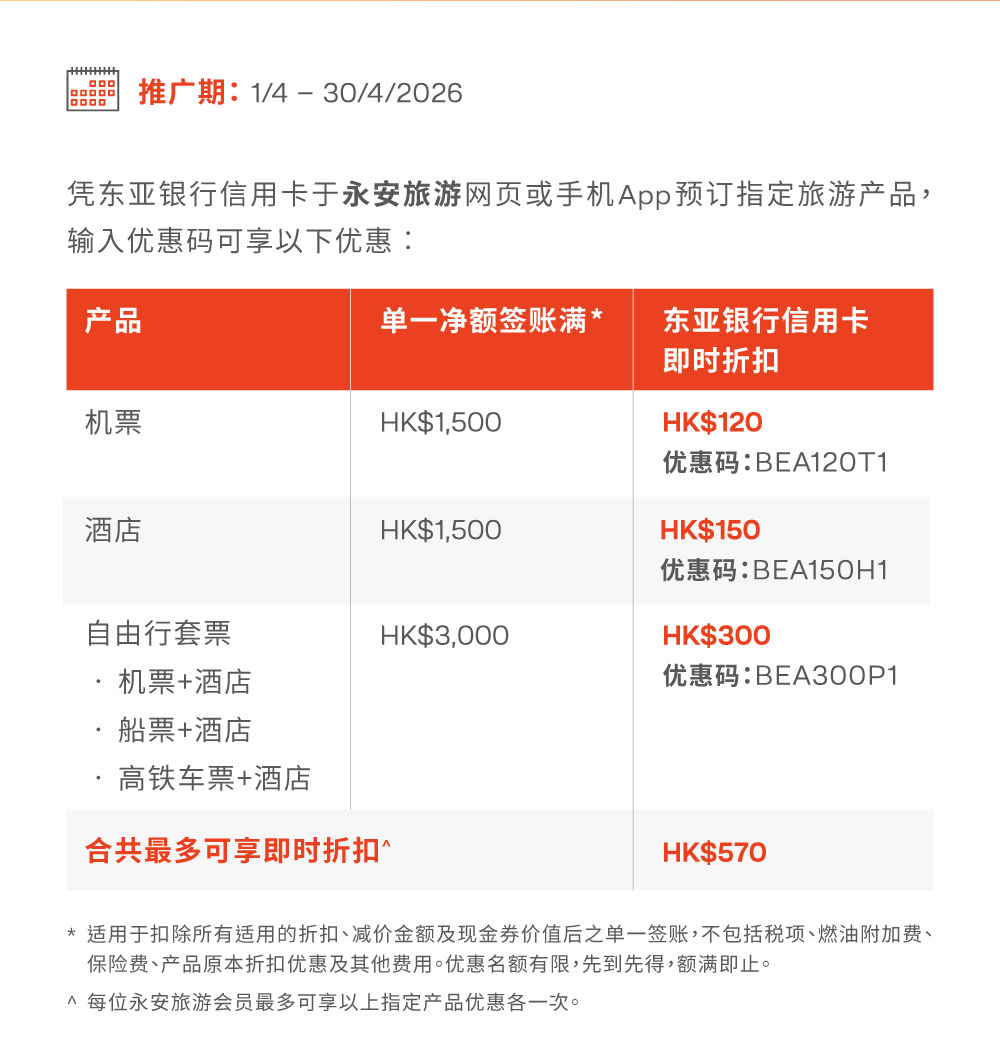 旅游乐全保保费75折及额外优惠(此保险计划由蓝十字承保,东亚银行为蓝十字之获委任保险代理商 。)