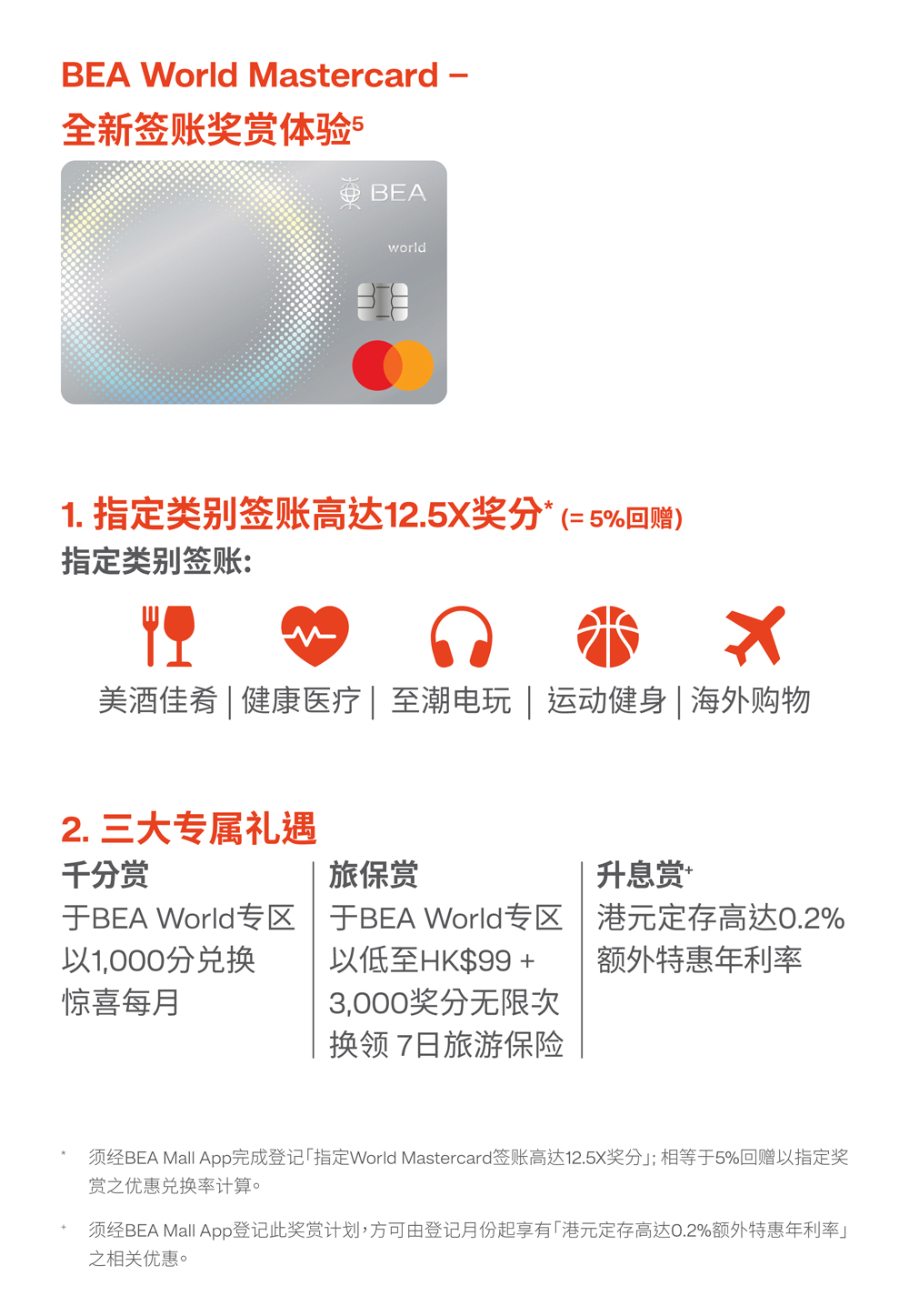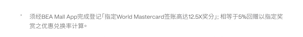 于推广期内申请东亚银行World Mastercard卡,符合以下所列之累积合资格签账要求,可获赠相应组别之迎新奖赏2: