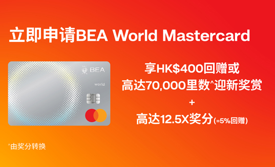 2025年6月23日至2026年1月20日推广期间,申请东亚银行World Mastercard卡可享迎新奖赏1HK$400现金回赠或高达70,000里数(由奖分转换2,4)。详情如下: