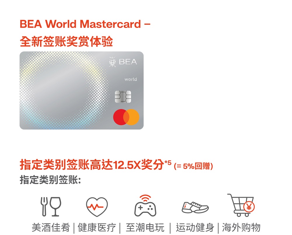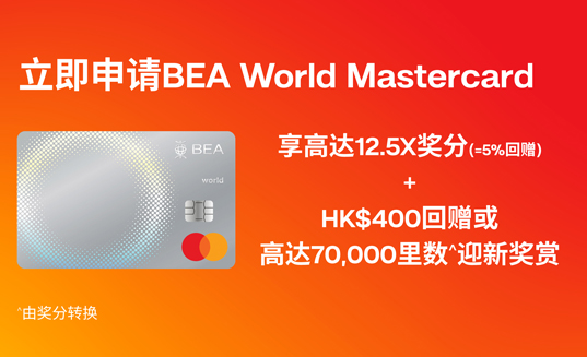2026年1月21日至2026年3月31日推广期间,全新信用卡客戶#申请东亚银行World Mastercard卡可享迎新奖赏1HK$400现金回赠或高达70,000里数(由奖分转换2,4)。详情如下: