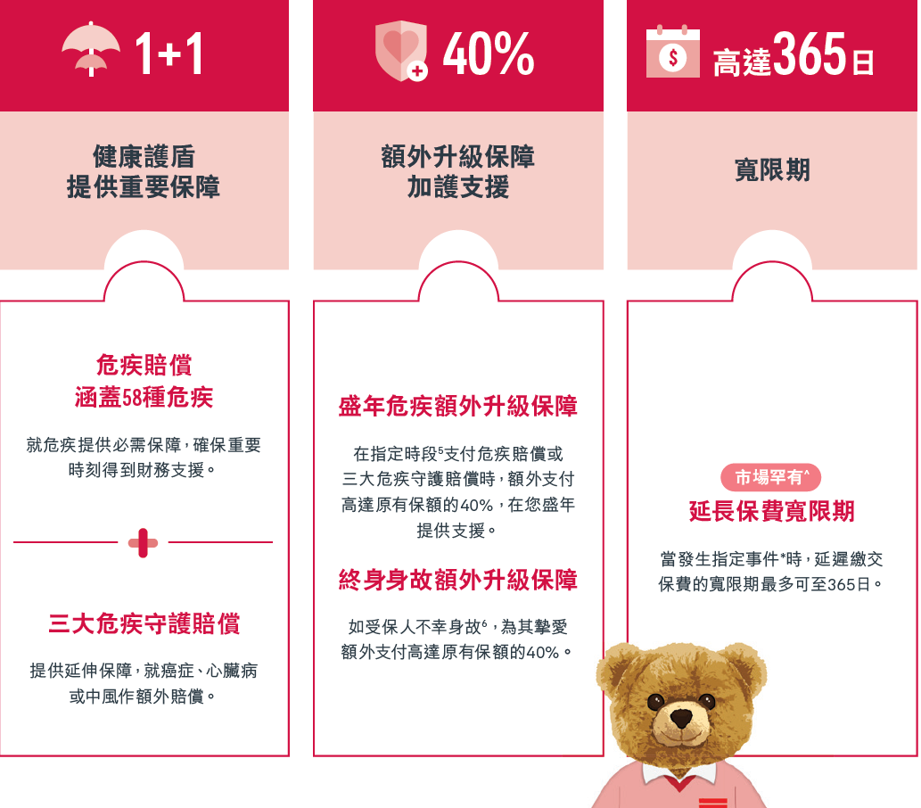 • 如三大危疾守护赔偿获支付,额外升级保障金额的100%(即原有保额的40%)将获支付。