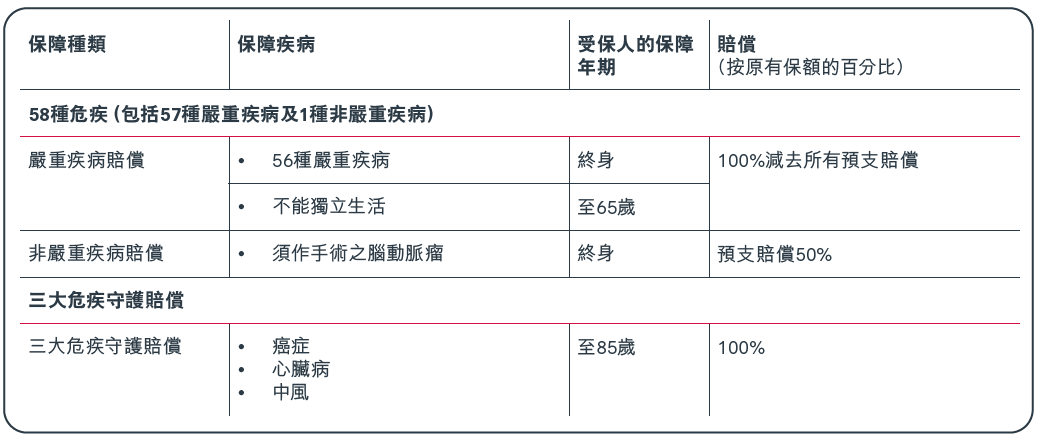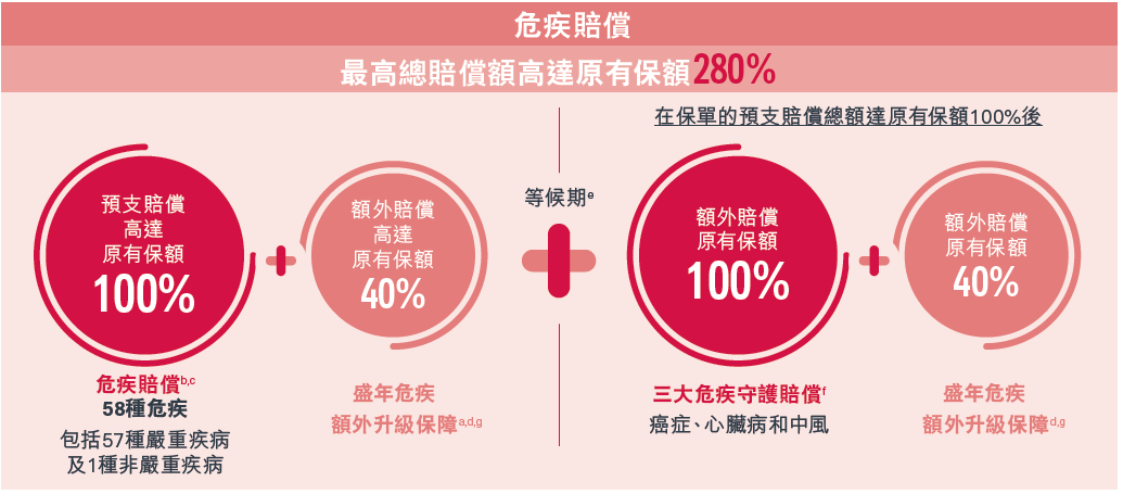 • 如非严重疾病赔偿获支付,额外升级保障金额的50%(即原有保额的20%)将获支付。