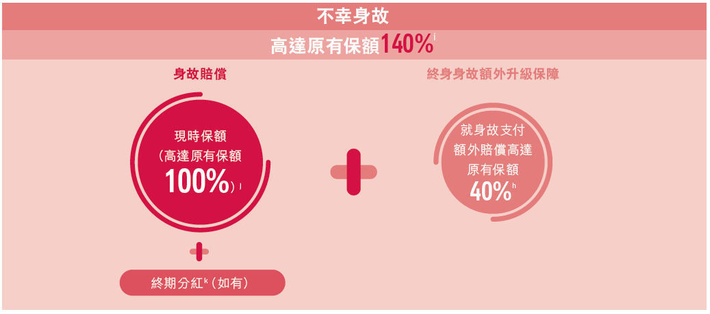 终身身故额外升级保障(如适用)亦可能会与身故赔偿一同支付予保单受益人。此保障为额外赔偿,相等于额外升级保障金额的100%(即原有保额的40%)h。