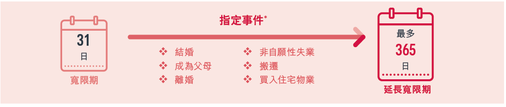 如我们批准您的申请,延迟缴付保费的宽限期将会由保费到期日后的31日延长至最多365日,为您提供额外的财务弹性,同时我们会继续为受保人提供保障及保单仍然生效。每份保单仅可索偿「延缴保费惠益」一次,并须向我们提供相关文件证明。