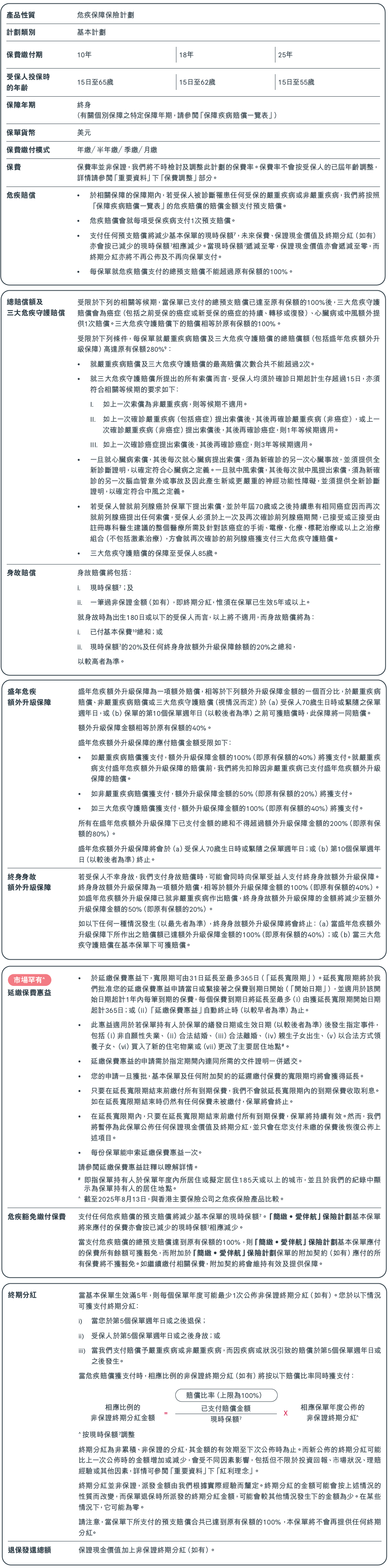 c. 当危疾赔偿获支付时,非保证的终期红利(如有)亦将获支付。终期红利为非保证的分红,可能在基本保单生效满5年后于保单退保、受保人身故,或当获支付严重疾病或非严重疾病的预支赔偿时可获支付。详情请参阅「保障一览」。