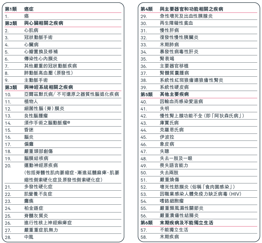 58种危疾(包括57种严重疾病及1种非严重疾病)