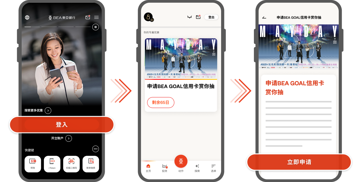 由即日起至2026年2月28日,全新信用卡客户1,2于BEA Mobile, BEA Online或本行网站成功递交BEA GOAL信用卡主卡申请,即可参加抽奖一次,成功申请有机会赢得五月天演唱会门票 2 张(每张门票价值HK$1,855,名额 : 20 名)!