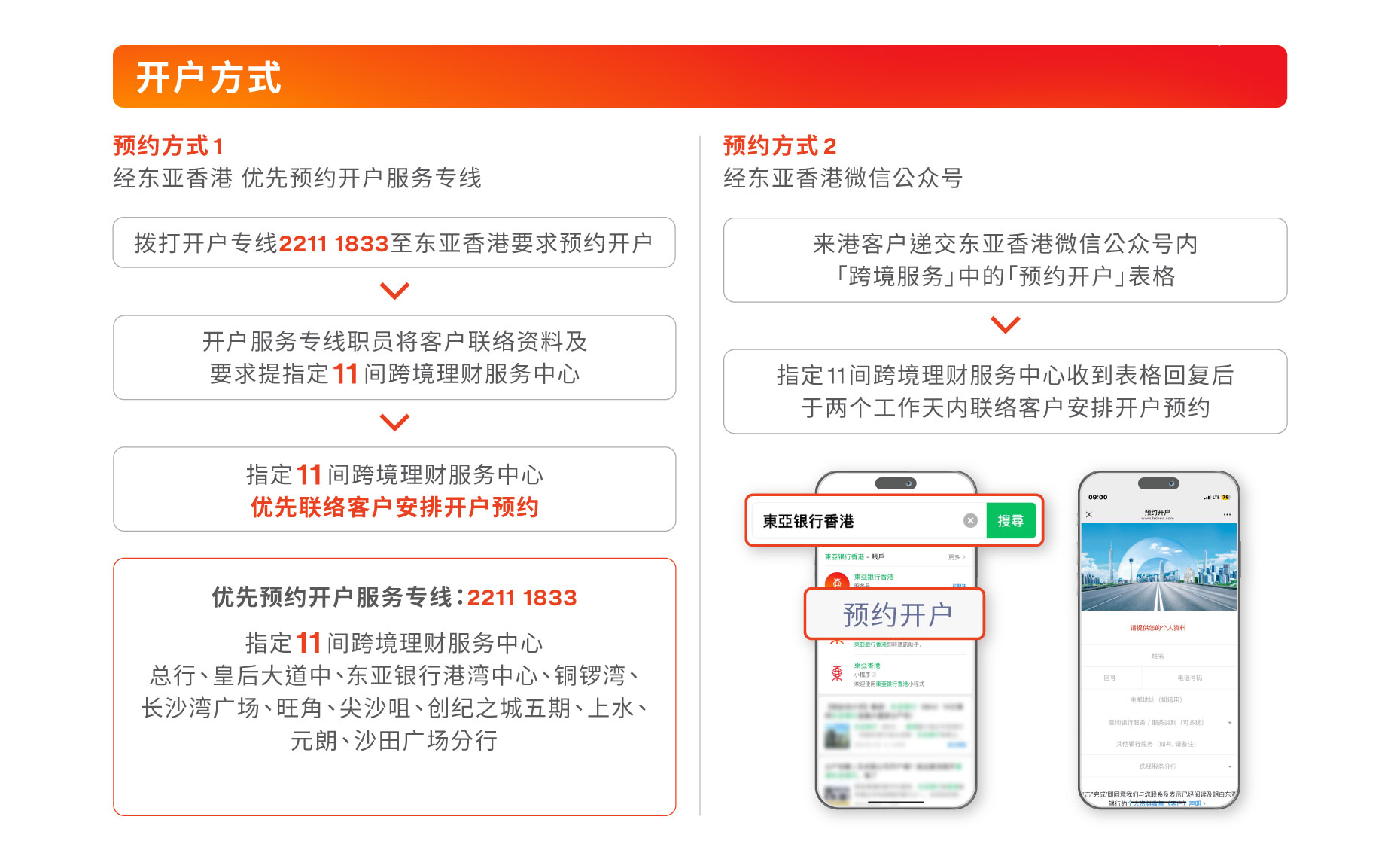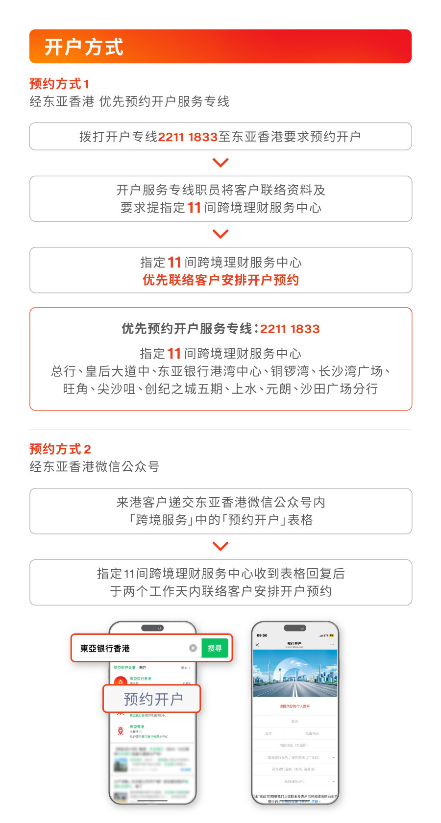客户可致电"优先预约开户服务专线"2211 1833,东亚香港 Call Centre 会记录客户联络资料及开户需求,并转交至指定的 11 间跨境理财服务中心,由相关中心优先联络客户安排开户预约时间。
