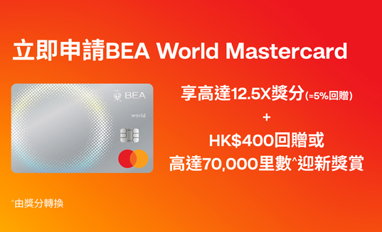 於推廣期內申請東亞銀行World Mastercard卡,憑新卡作合資格簽賬滿HK$4,000或以上。