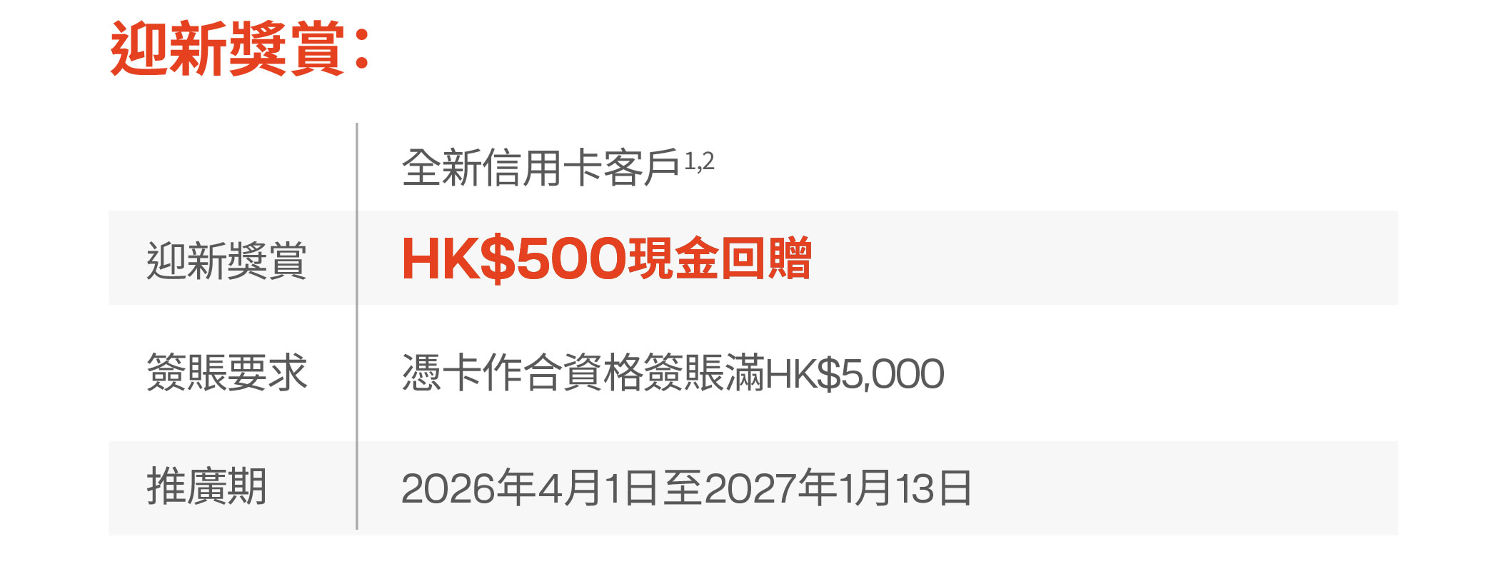- 迎新獎賞只適用於遞交申請日及批核之前6個月內並無持有任何東亞銀行信用卡主卡(不包括東亞銀行公司卡、所有聯營卡、附屬卡或特選客戶)。「現有信用卡客戶」不能獲享迎新獎賞。