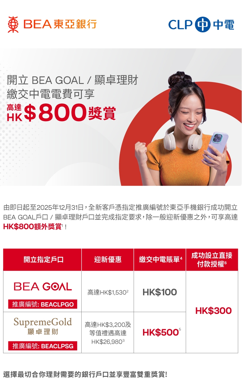 - 除非另有註明,BEA GOAL迎新推廣期至2025年12月31日,優惠受條款及細則約束,詳情請按此。