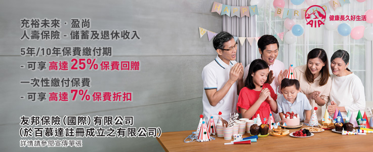 - 以上產品資料並不包含保單的完整條款,有關產品特點、條款及細則、不保事項及主要產品風險之詳情,請參閱相關產品之產品簡介及保單契約。如欲在投保前參閱保險合約之樣本,您可向AIA索取。人壽保險保單屬長期的保險合約。如於早年退保,您所收取的金額可能大幅少於已繳的保費。
